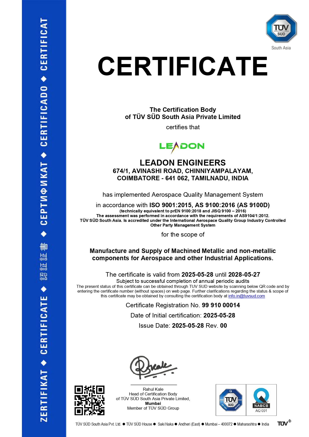Leadon Engineers is an AS 9100:2016(AS 9100D) certified small scale precision manufacturing unit located at Coimbatore southern part of India By utilizing the robust quality system we are providing most cost effective solutions with high quality machined parts at on-time delivery to satisfy our customer's needs.
